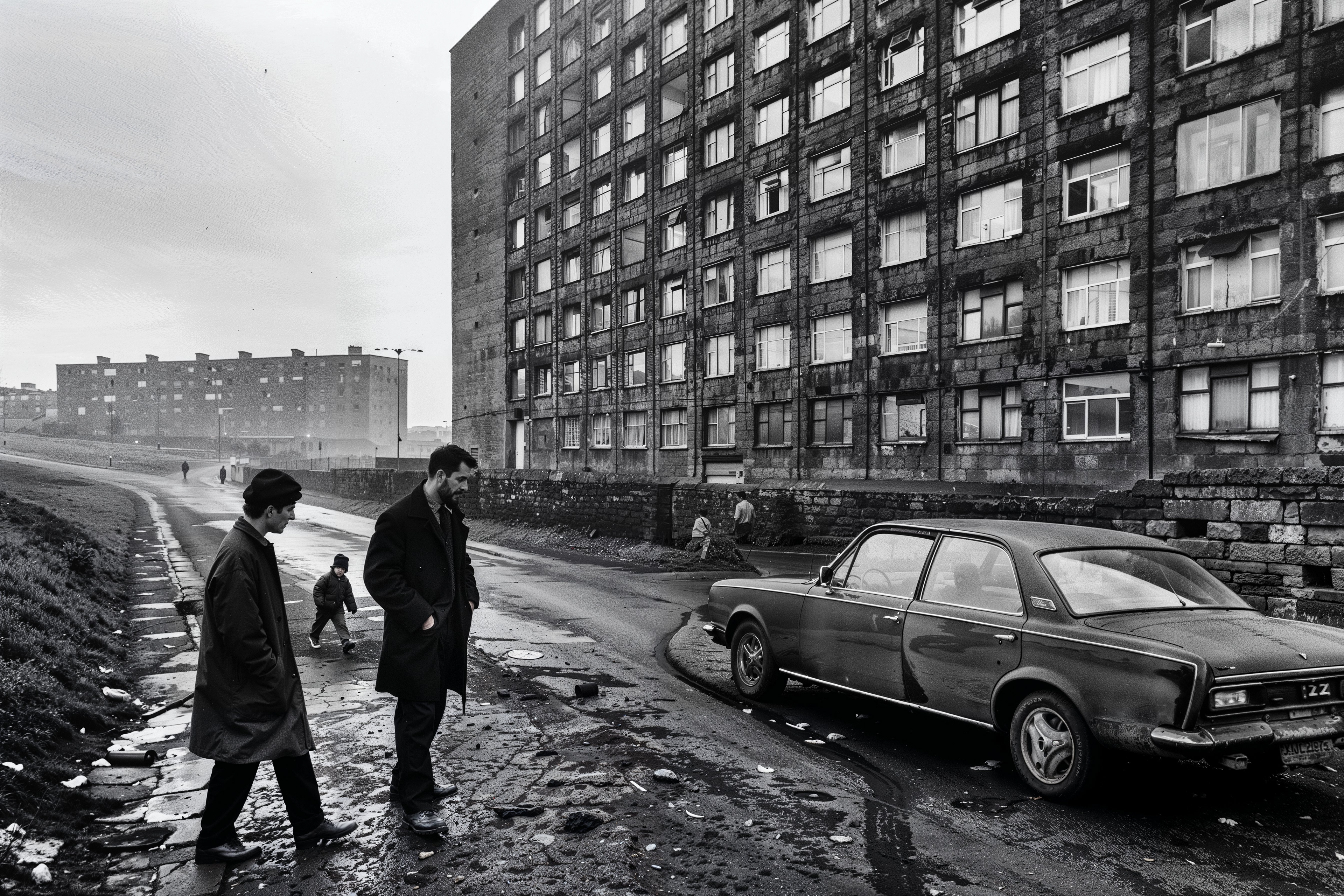 The image distils that detached disconnect, freezing in time the transient bridge between the tightly-knit, fading working-class enclave and the impersonal monolithic future looming ahead for its soon-to-be displaced occupants.