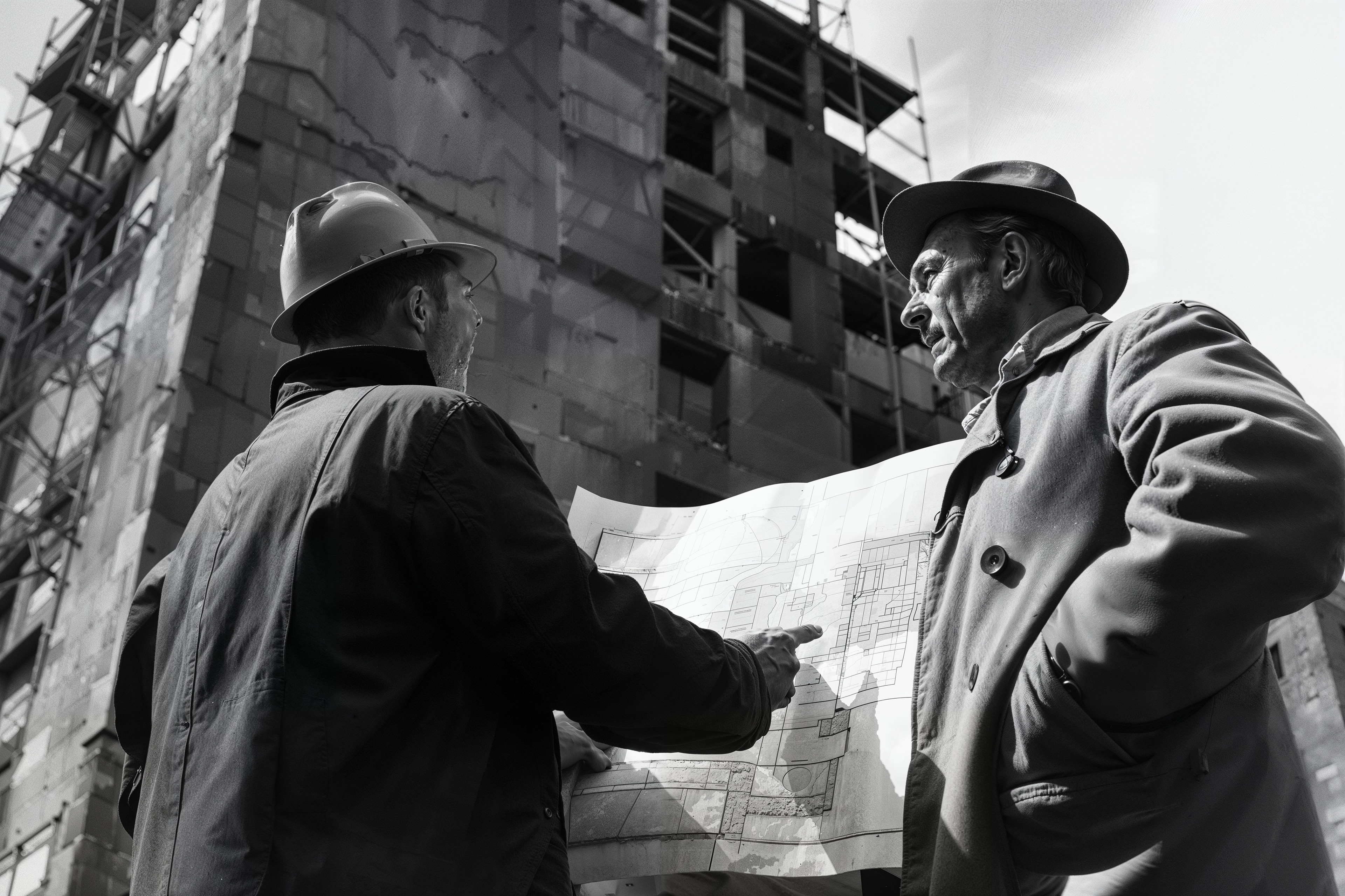 The image captures two focused project managers, examining blueprints, while skeletons of new high-rise buildings loom in the background. Tremendous demands were placed on the construction team tasked with realising the council's bold vision for urban reinvention.