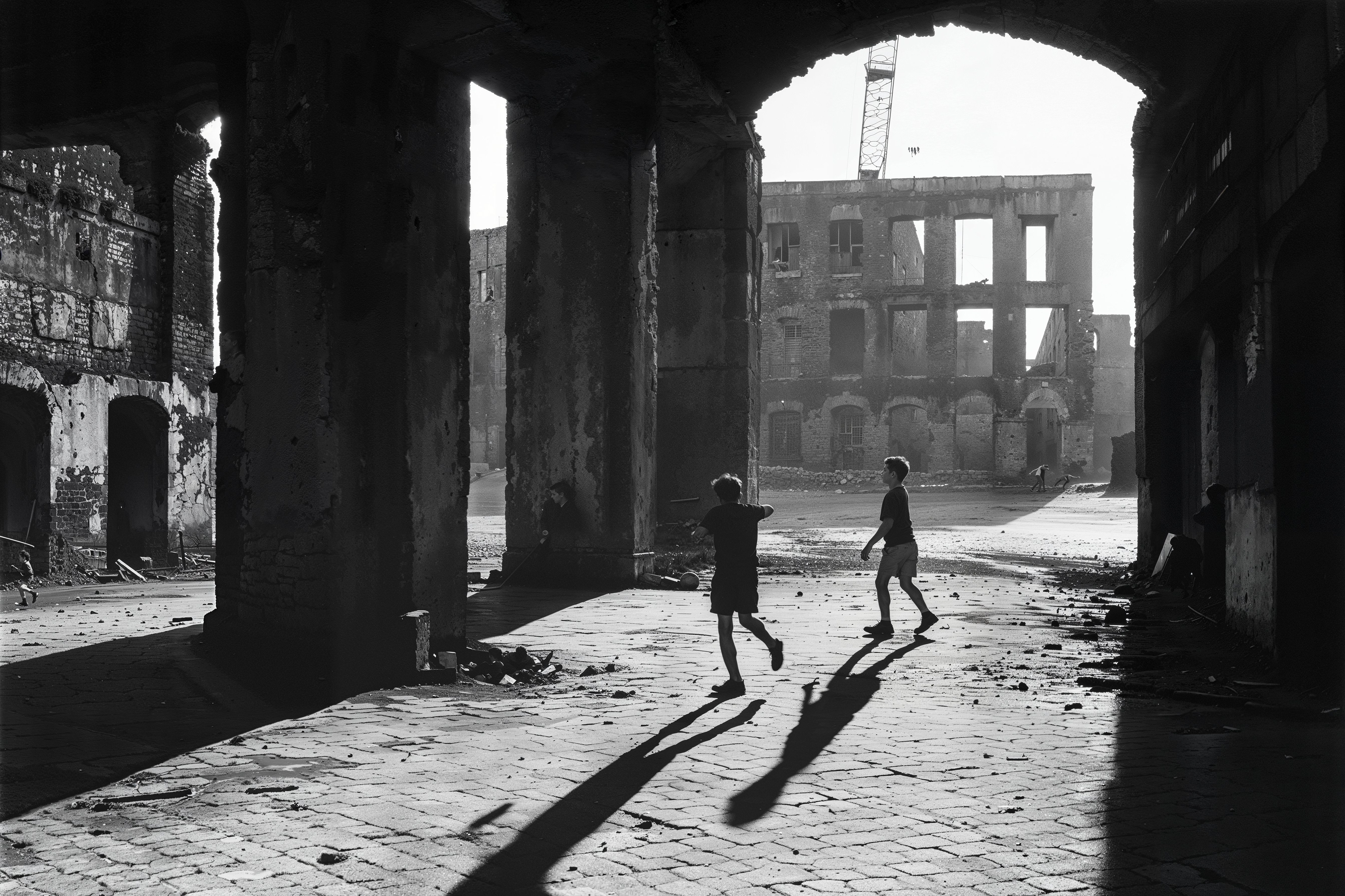 The bare structural bones hinting at former lives, stand in stark contrast to the solitary figures of the children. Their small silhouettes dwarfed and cast in sharp relief by the ruins' immense shadows. Their carefree movements inject an unsettling dichotomy against the obliterated architecture.