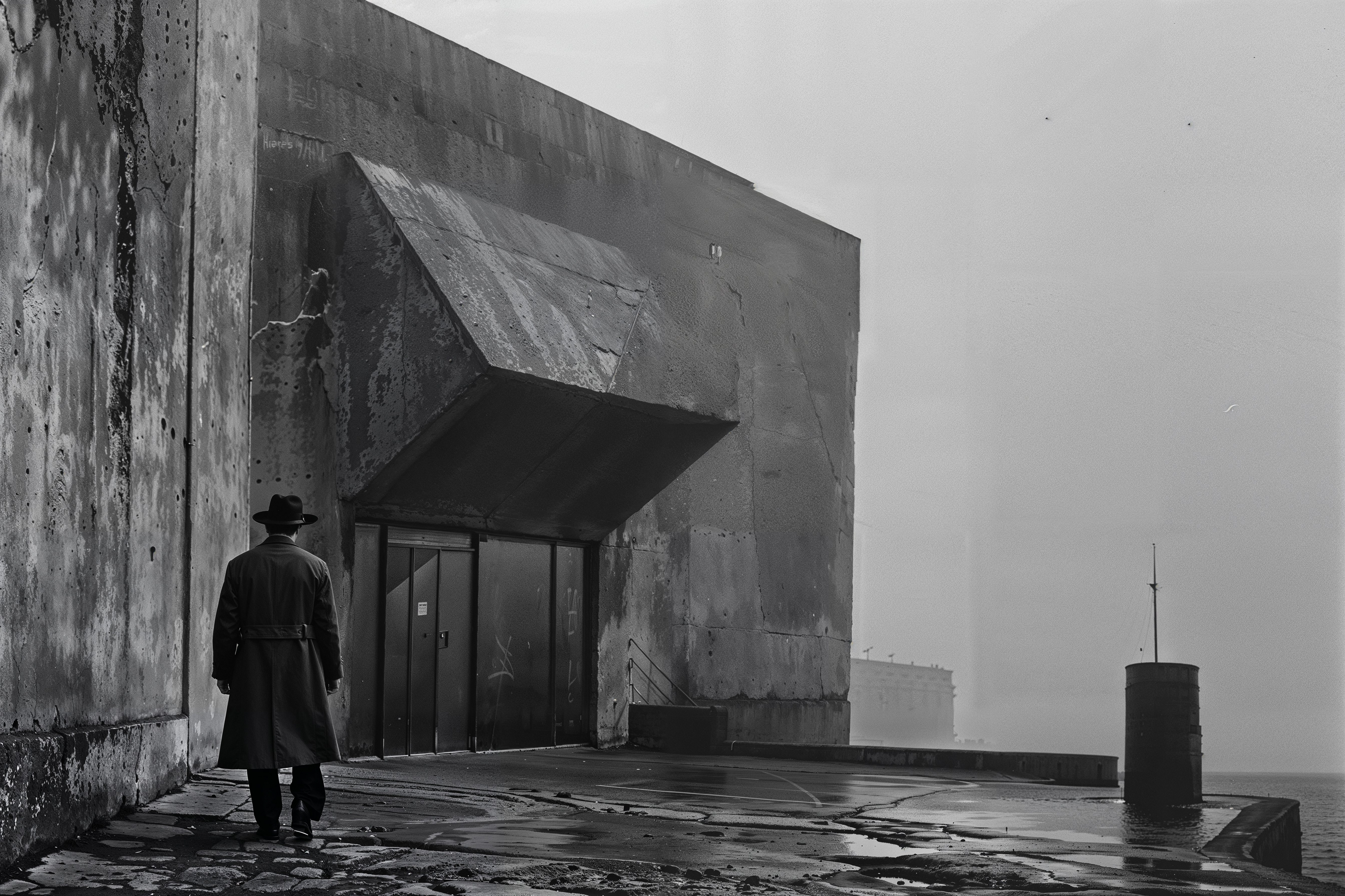 A solitary figure in trenchcoat and fedora resolves through the hazy outlines - Thomas Danielson himself, walking away from the camera's prying lens as he approaches the imposing, anonymous facade of Daedalus Architects' sanctum sanctorum.