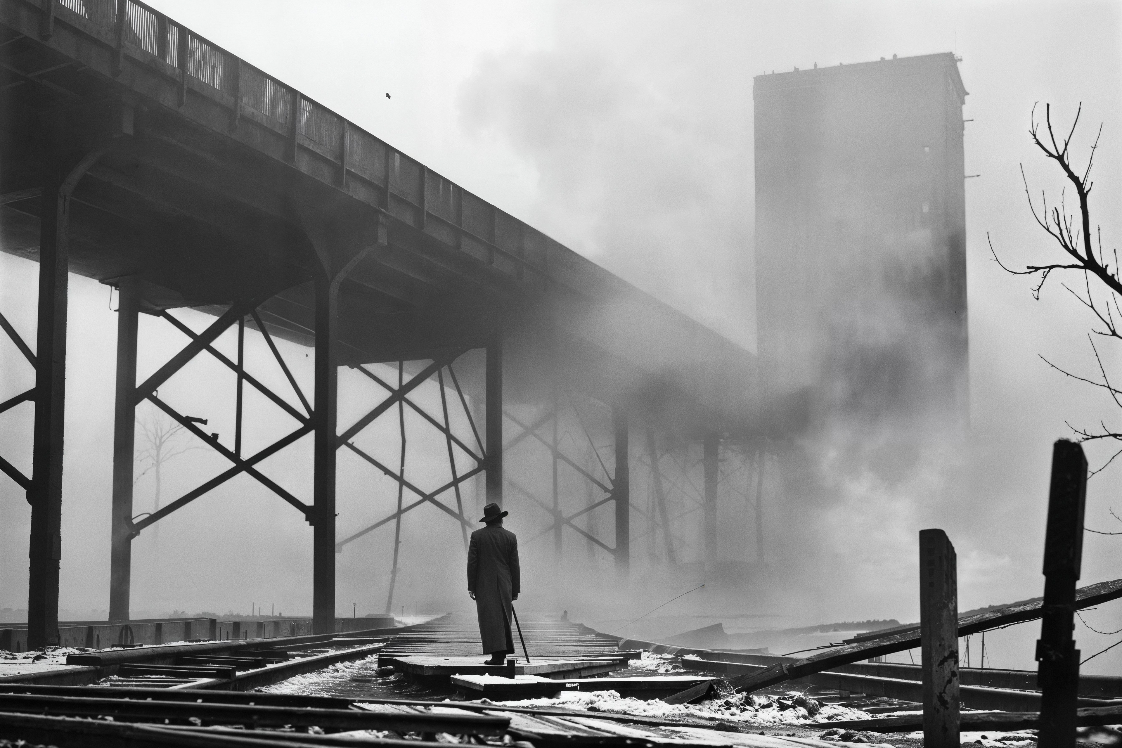 The lone silhouetted figure of Thomas Danielson himself cuts an almost supernatural presence, dwarfed amidst the towering brutalist structures that have become his life's work and legacy. Fog swirls around the monolithic slabs of steel and concrete, lending an ethereal, post-apocalyptic air.