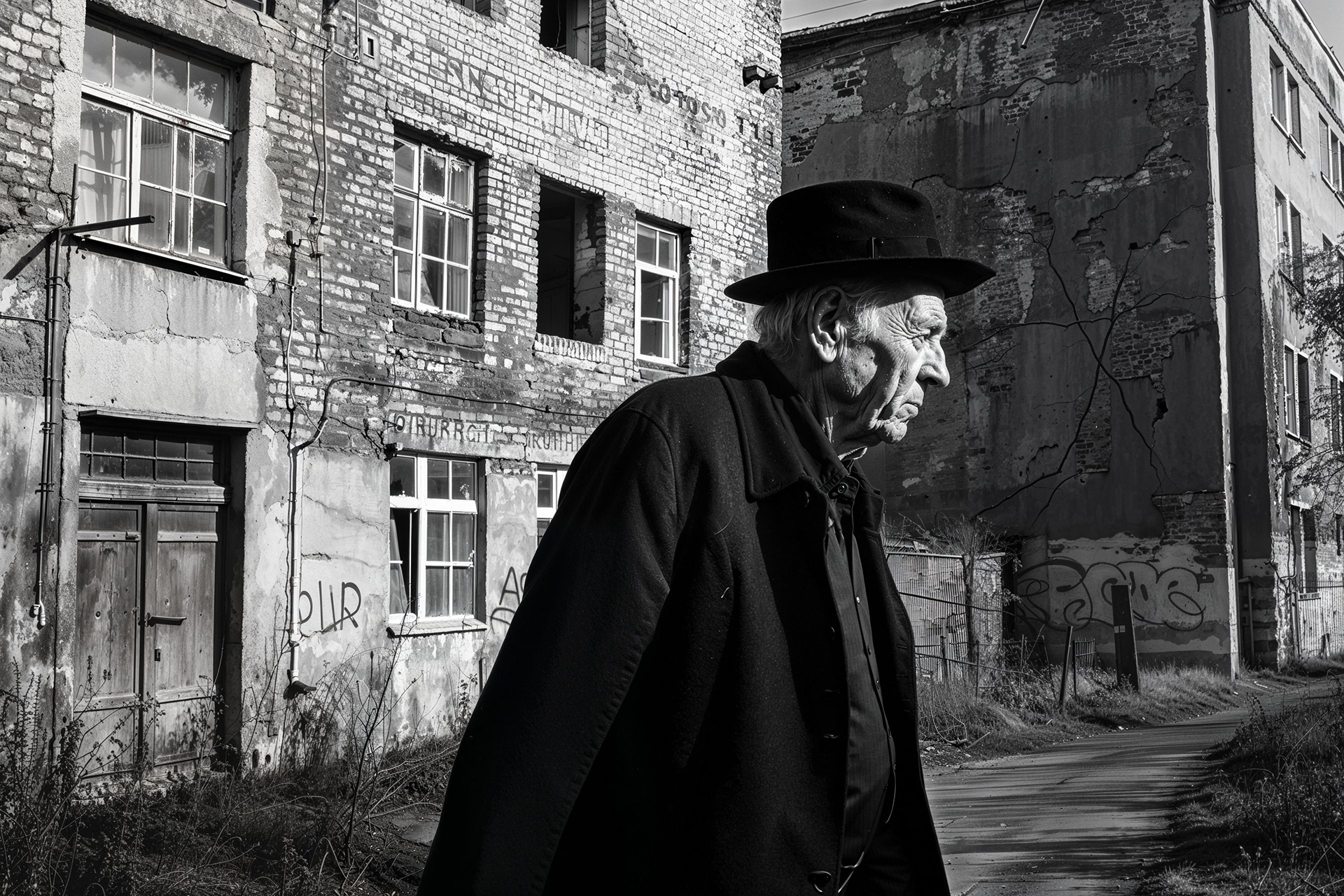 The black and white image captures architect, Thomas Danielson, determinedly marching from an old warehouse housing a local arts collective. Unseen protesters plead for him to pause and explain his decision to demolish the building. Danielson refuses to break stride or even acknowledge the protesters or photographer’s presence. His path is singular, his vision for progress, unyielding.