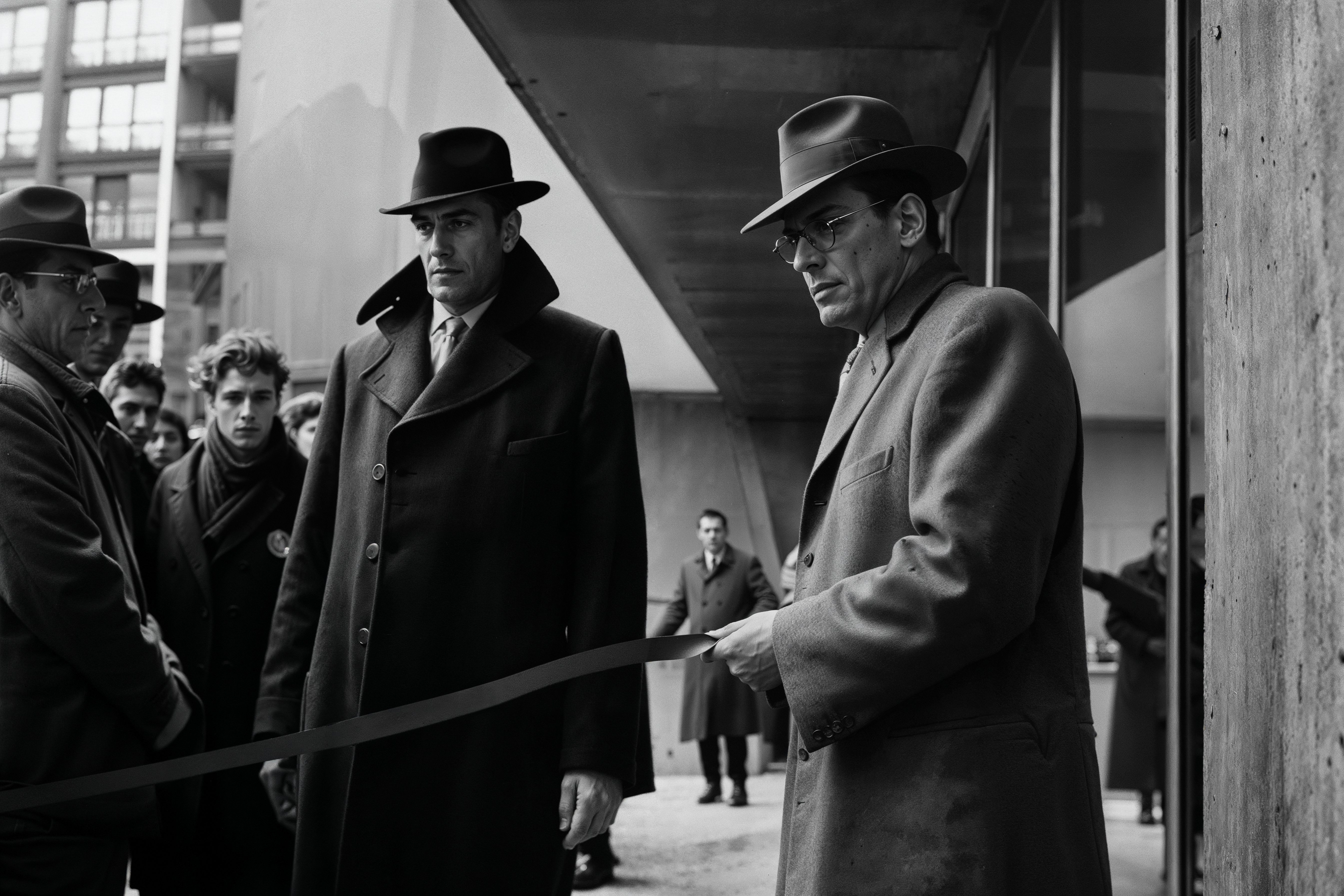 Outfitted in expensive overcoats, the Daedalus Security Officers prepare for a ribbon cutting of a severe civic building. Though protesters remain largely unseen, their chants and jeers reverberated faintly - disembodied cries straining against the imposing monolith's indifference.